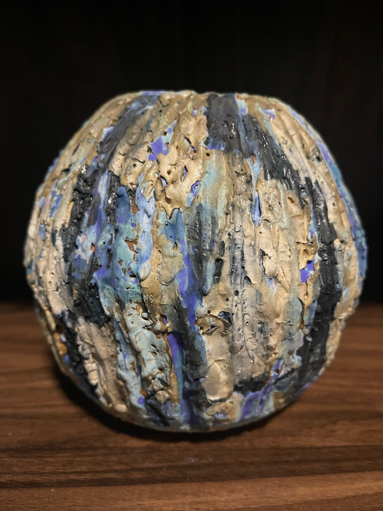 The piece that caught my eye was a small vase, maybe five inches tall, spherical with organic ridges running around its surface like waves frozen mid-motion. The glaze was extraordinary—blues and purples that shifted and swirled into each other, no two sections quite the same color, the whole thing looking almost volcanic, like something created by geological processes rather than human hands. I picked it up and it fit in my palm perfectly, dense and cool to the touch.