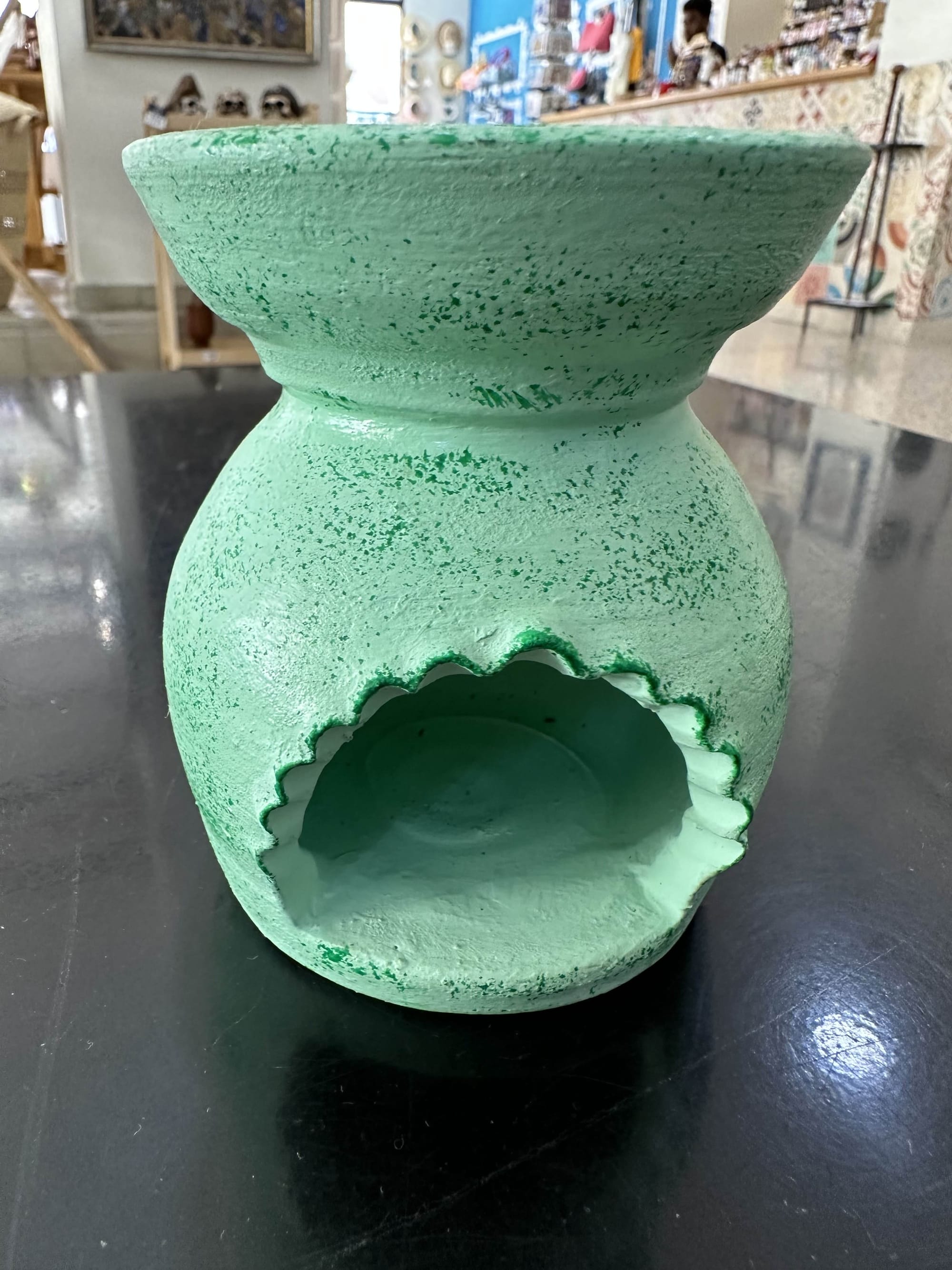 The oil burner was made by a woman who sat behind her table looking slightly bored. She had maybe a dozen pieces for sale, all in the same mint-green glaze, each slightly different in shape. The one I chose was maybe four inches tall, with a scalloped opening at the base for a tea light candle and a small dish on top for the oil. The glaze had a speckled texture, imperfections that spoke to hand-mixing and wood-firing and all the things that mass production eliminates. When I held it, I could feel the slight variations in thickness where her hands had shaped the clay.