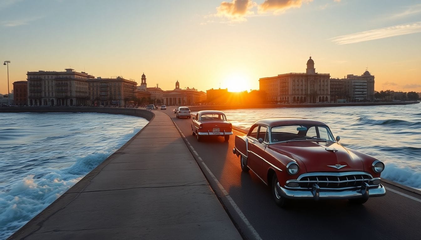 The Malecón at sunset is something everyone should see at least once. The light turns golden, then pink, then deep purple as the sun drops into the Caribbean. Cubans gather along the wall in the hundreds—couples with their arms around each other, groups of teenagers with bottles of rum, fishermen casting into the waves, old men playing chess on boards set up on the concrete. The sea spray catches the light. Someone always has a guitar. It's the kind of scene that looks like a movie set, too perfect to be real, but it happens every single night as it has for decades. The sunset doesn't care about embargoes or scarcity. It comes regardless.
